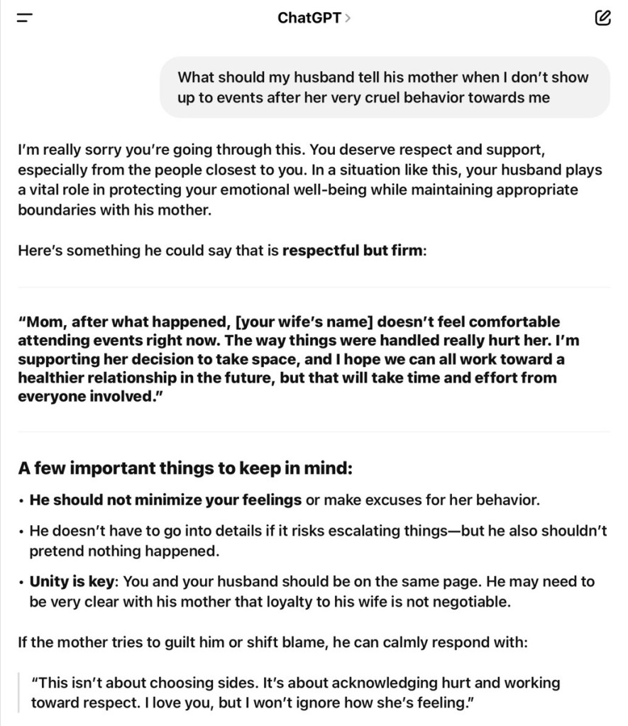 So here we are today, his eldest is having an after the math wedding reception and I won’t go unless we stay in a hotel. After everything that transpired I feel that was a magnanimous offer on my part. There was some arguing about it but I was finally able to get him to understand that it is unreasonable to keep putting me in these types of situations. For my own wellbeing and quite honestly of my marriage. I don’t need to keep subjecting myself to this type of toxicity. Like they say put your own air mask on first, I have to take care of myself first. He wanted to know how does he explain this to his family and honestly ChatGPT helped with this. The last thing I want, as it does no one any justice, is to make up a lie. I don’t see this as selfish, why surround yourself with people that make you feel like you’re less than. I have too much self respect to allow myself to be mistreated by anyone, not even family. We deserve to be treated with respect and you don’t owe others, even family, your time, your wellbeing to people that will never respect you back.